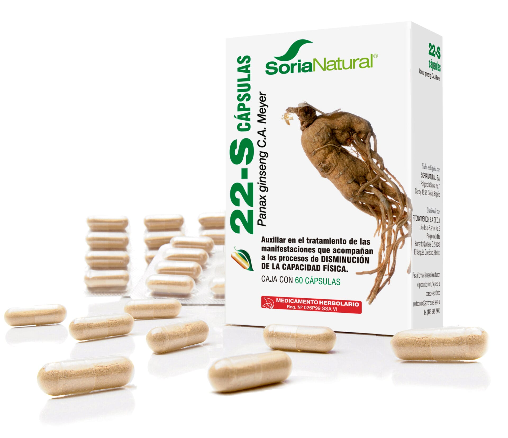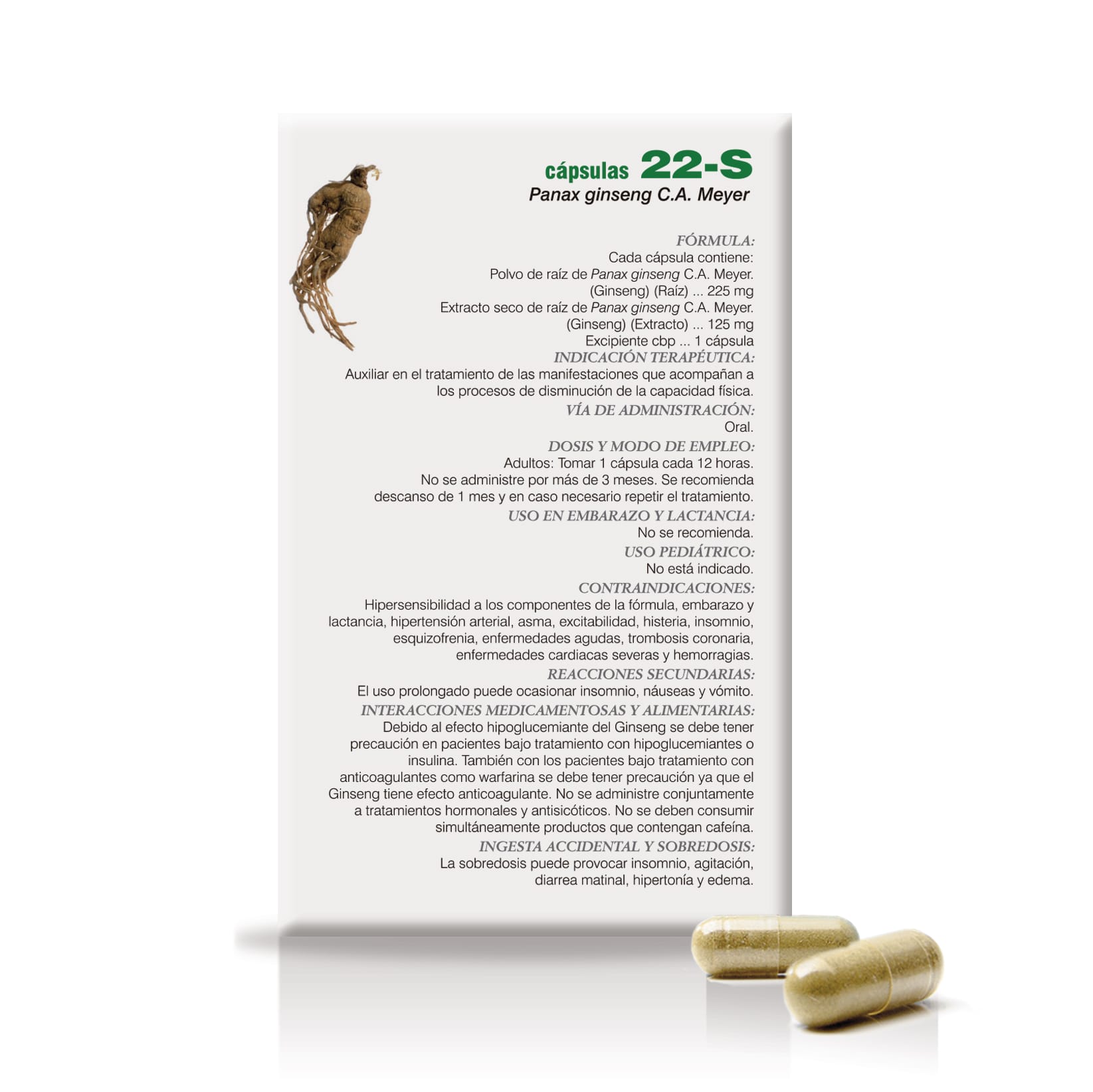 Medicamento Herbolario22-S Cápsulas es un medicamento herbolario que contiene Ginseng. Auxiliar en el tratamiento de las manifestaciones que acompañan a los procesos de disminución de la capacidad física.