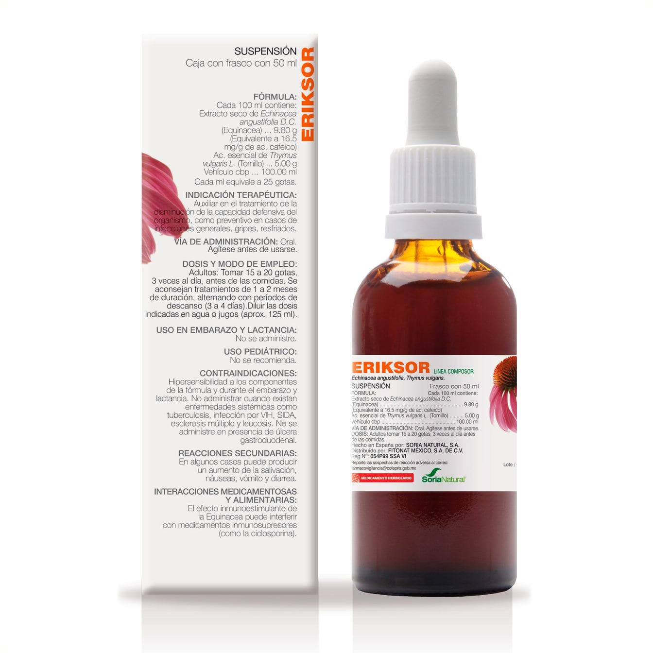 Medicamento HerbolarioEriksor es un medicamento herbolario elaborado con equinácea y tomillo, auxiliar en el tratamiento de la disminución de la capacidad defensiva del organismo, como preventivo en caso de infecciones generales, gripes, resfriados.